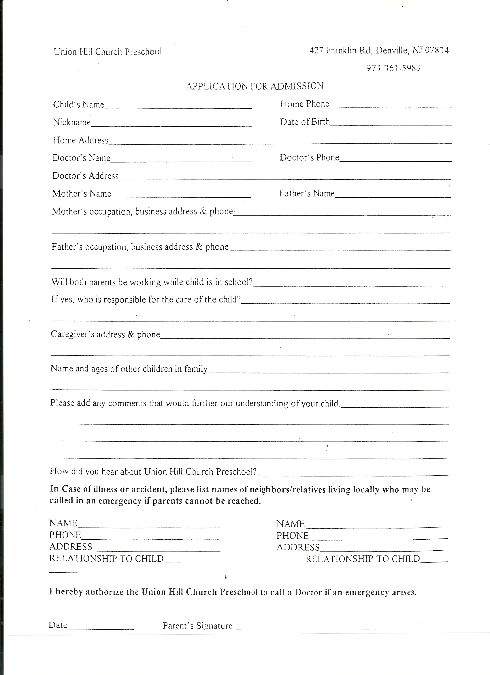 Union Hill Church Preschool is a not for profit organization sponsored by the Union Hill Presbyterian Church. The Union Hill Church Preschool is non denominational and does not discriminate on the basis of race, color, creed, nation or ethnic origin.